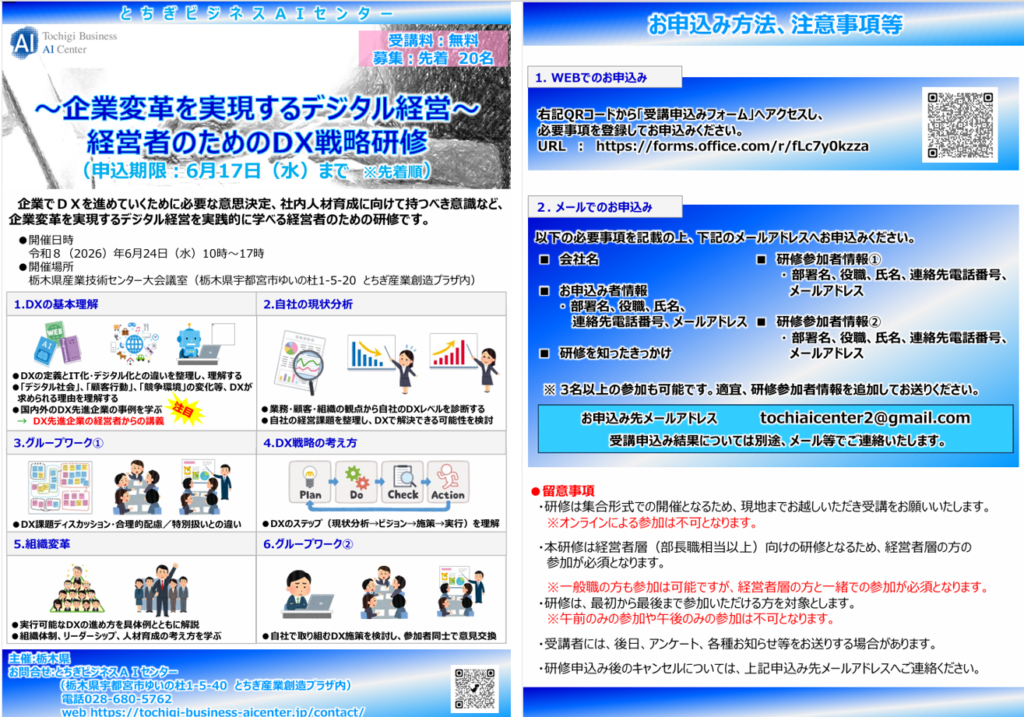 とちぎビジネスAIセンターでは下記のとおり、経営者のためのDX戦略研修参加企業の参加者を募集いたします。